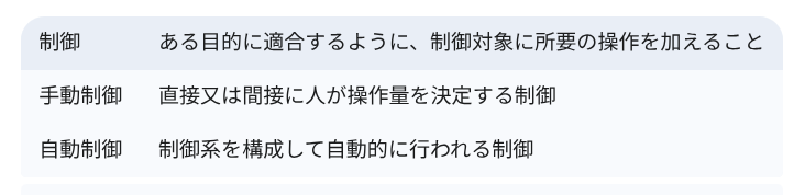 制御とは、ある目的に適合するように、制御対象に所要の操作を加えることと記載されている。