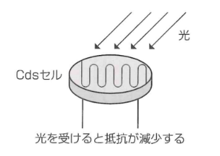 光センサには、光を受けると抵抗が減少する性質を持つCdSセルと呼ばれる部品が使われている。