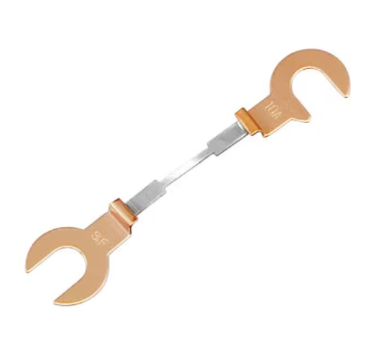 ヒューズの内部には、融点が低い金属(可溶体またはエレメント)が内蔵されている。