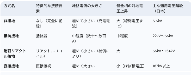 その接続方法によって「非接地」「抵抗接地」「消弧リアクトル接地」「直接接地」の4種類に大別される。