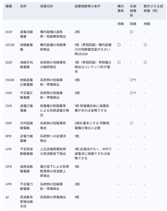 連系する電力系統の区分(高圧連系/特高連系など)・分散型電源の種類(同期発電機/誘導発電機など)・売電の有無(逆潮流)などによって、設置する継電器が異なる。