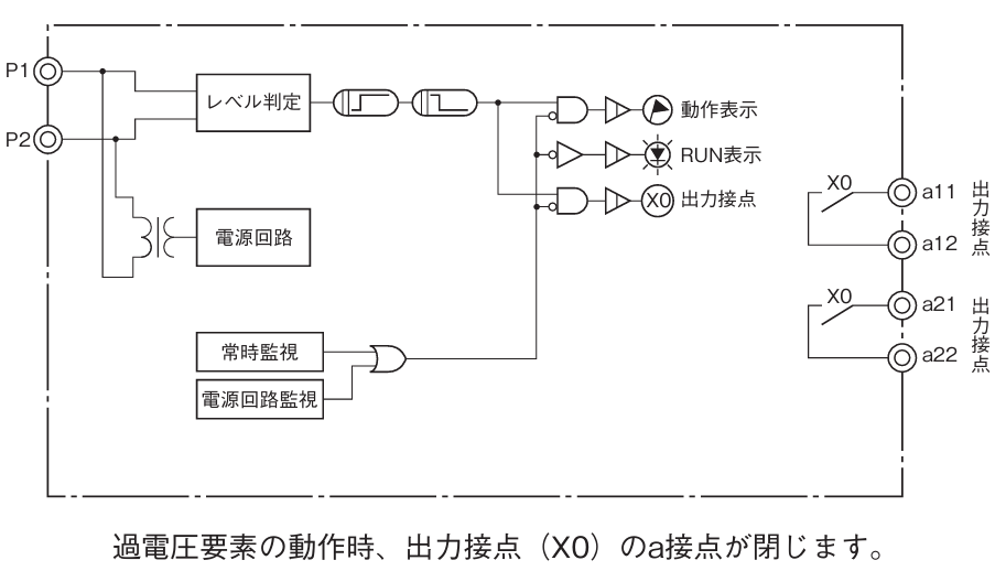 電圧が整定値を超え続けている時間を監視する。設定された限時時間が経過すると、動作指令を出す。 - 出力リレー