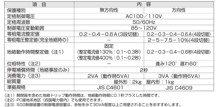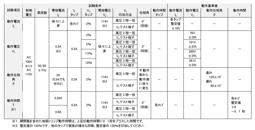 ※1. 開閉器を含めた地絡トリップ動作時間は、上記の動作時間に0.1秒をプラスした時間。