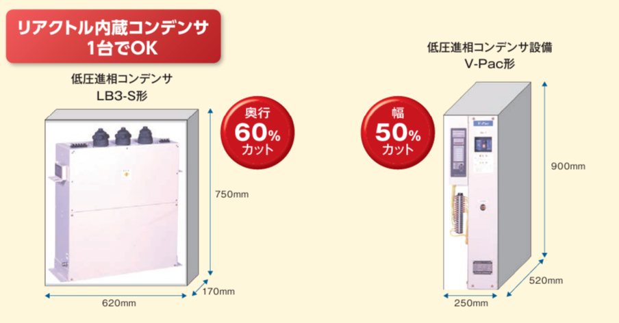 コンデンサと直列リアクトルが一体型になっているため、個別に設置するよりも設置スペースを節約でき