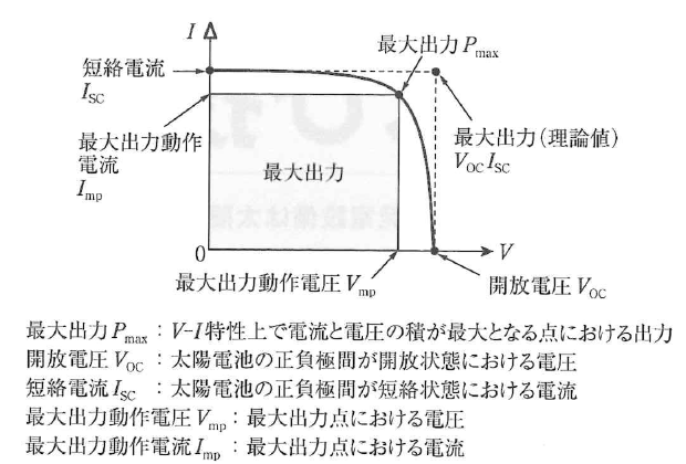 また、理論上の最大出力は開放電圧VOC × 短絡電流ISCで表され