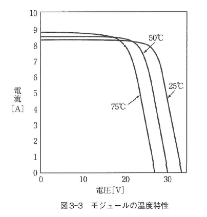 モジュールの両端を開放状態にしたときの電圧で、光の強さ(放射照度)が強いほど、また温度が低いほど開放電圧は高くなる(下記図参照)。
