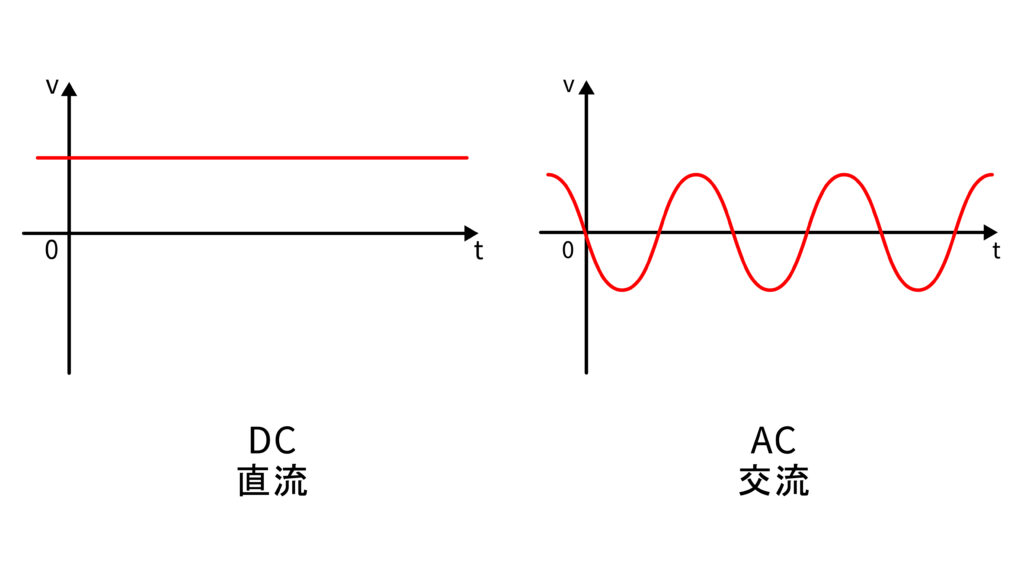 電圧には上記図のように、大きさと向きが常に一定で変化しない直流と、
