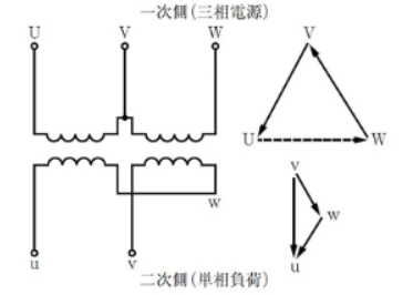 三相電源(U相、V相、W相)から単相の電力を取り出す際に用いられる。