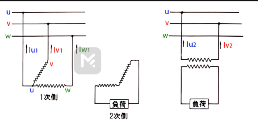 逆V結線変圧器は、三相電源から単相負荷を取り出すための結線方式の一つ。