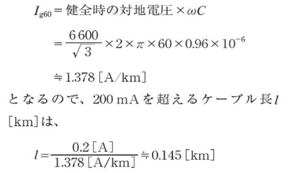 地絡時の流出電流は抵抗分を無視すると、60Hzの場合、1km当たりの地絡電流Ig60[A/km]は、