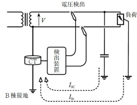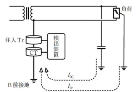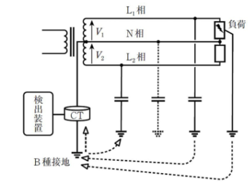 商用電圧(50Hzまたは60Hz)による漏えい電流をB種接地線に取り付けたCTで検出する方式。