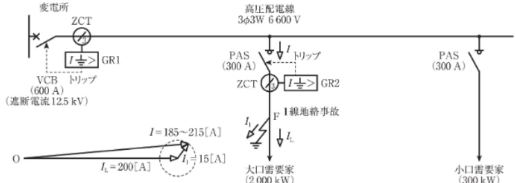 上記図に示すように、需要家構内 (F 点) で 1 線地絡事故が発生した場合