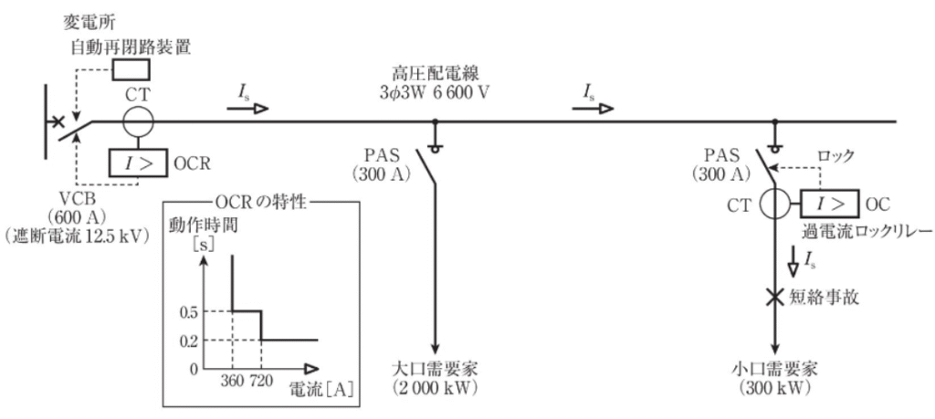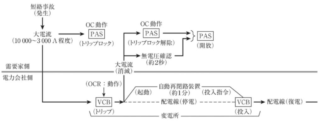 短絡電流は最も小さい値でも PAS の開閉能力を大幅に超えているのでPAS でこの電流を開放することはできない。 PAS にこのような開閉能力以上の電流が流れると、ロックがかかり、開放しないようにされる。
