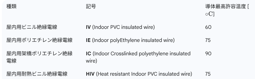 | IV | 600Vビニル絶縁電線 | PVC(ポリ塩化ビニル) | 60∘C | 最も一般的。屋内配線、がいし引き工事、コンジット(電線管)内配線、盤内配線。 |