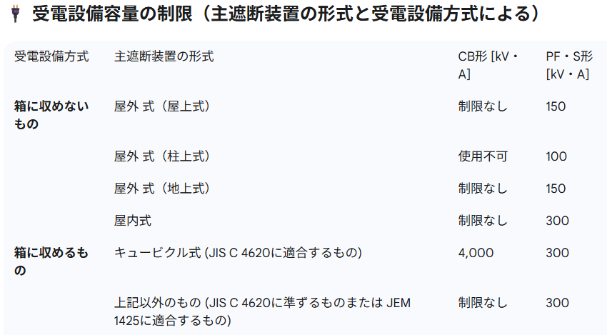 受電設備容量は、主遮断装置の形式および受電方式により、上表のそれぞれに該当する。