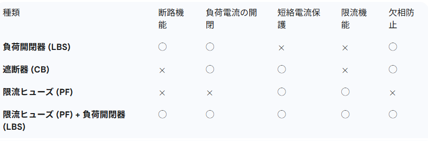 限流ヒューズと遮断器などの開閉機能を比較すると、下表のようになる。限流ヒューズは負荷開閉器と組み合わせて使用すると、より多くの機能が得られることがわかる。
