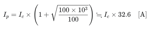 短絡容量 100 [MVA}の場所に 100 [kvar]のコンデンサを設置した場合の突入電流は