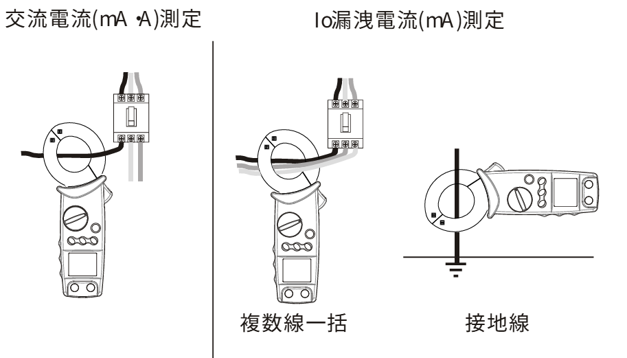 漏れ電流の測定は、単相の場合は2本一緒に、三相の場合は3本一緒に挟み込んで測定する。(下記図参照)