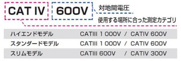 「CAT」とは測定カテゴリーというもので、測定できる場所、電圧範囲を示すもの。
