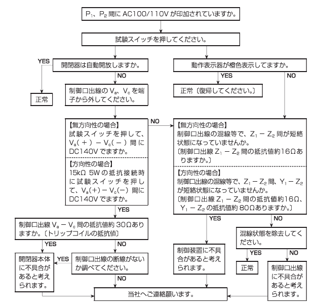 トリップコイルの回路が地面とショート(地絡)していないか、メガー(絶縁抵抗計)で確認する。