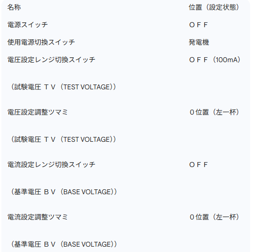 各スイッチ及びツマミを下記表の様に設定(設備停電の状態時)