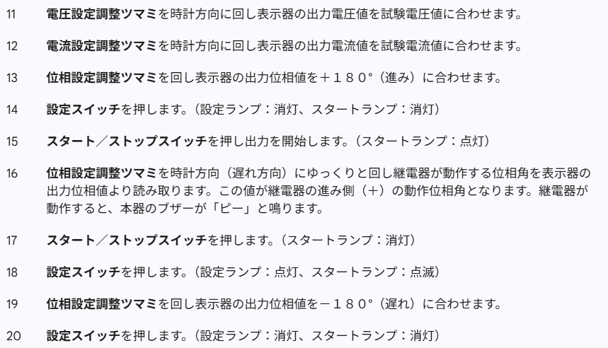 整定電流値の1000%の電流を流し,電流の位相を変えて継電器が動作する位相角を測定する。