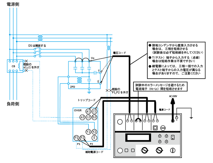 設備の一次側へ高電圧が発生する可能性があるので注意。